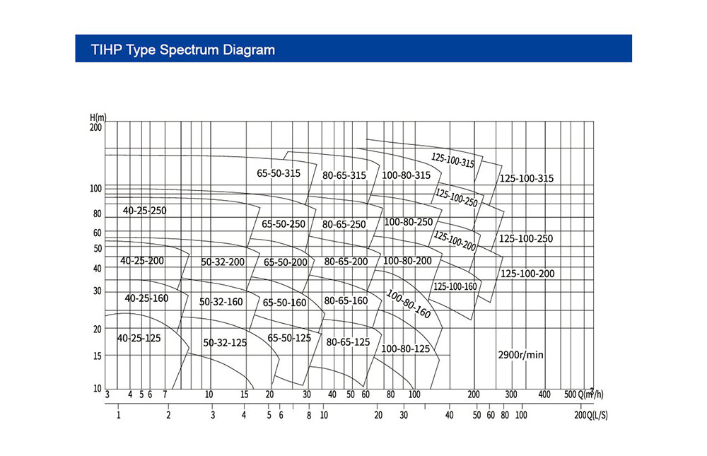 ไดอะแกรมมีหลายเส้นโค้งและโซนแต่ละอันแสดงถึงรุ่นปั๊มที่เฉพาะเจาะจง ตัวอย่างเช่น "40-25-125" และ "50-32-160" แสดงถึงรุ่นปั๊มที่แตกต่างกัน